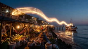A cantiga vira deslocamento. Já não é apenas passar o objeto; é viajar. O jogo ganha estrada, ida e volta, fluxo contínuo. A roda deixa de ser só círculo e se transforma em travessia. A língua faz turismo afetivo: leva a brincadeira para outro território e devolve com cheiro de rio, de mercado, de cais.