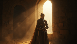 Frase 03 – “A luz entrava tênue pela janela aquela manhã, mas nada poderia agradar à vossa majestade. Os estrondos dos canhões e os tremores anunciavam que a queda de seu reino estava prestes a terminar. Sem parar para pensar, ela se levanta com sua armadura e segue para a frente de batalha. Sem esperanças, ela se une a seus soldados sucumbindo ao farelo da conquista pelo reino vizinho.”
